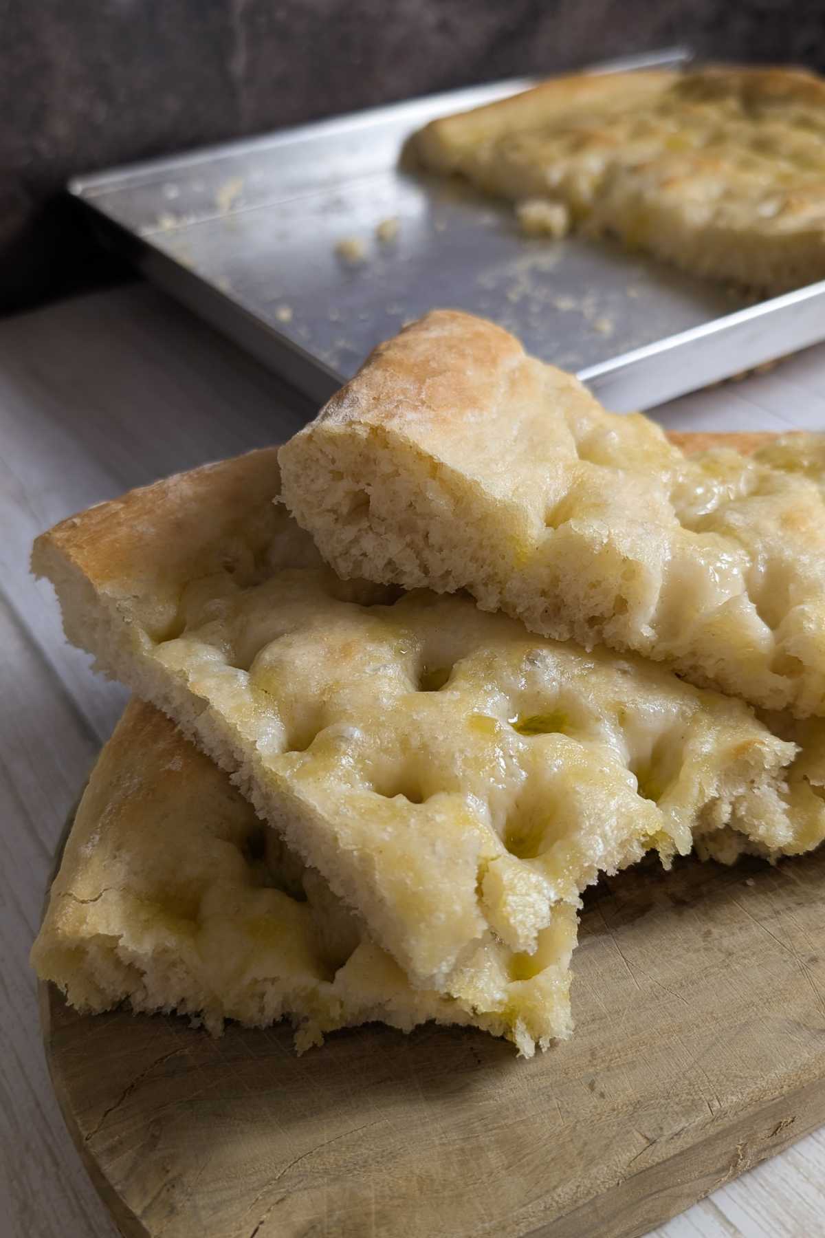 Focaccia genovese is best enjoyed fresh, ideally the same day it is baked, when the surface is slightly crisp and the inside remains soft and airy. If you need to store it, let the focaccia cool completely, then wrap it tightly in plastic wrap or place it in an airtight container. It can be kept at room temperature for up to 24 hours.