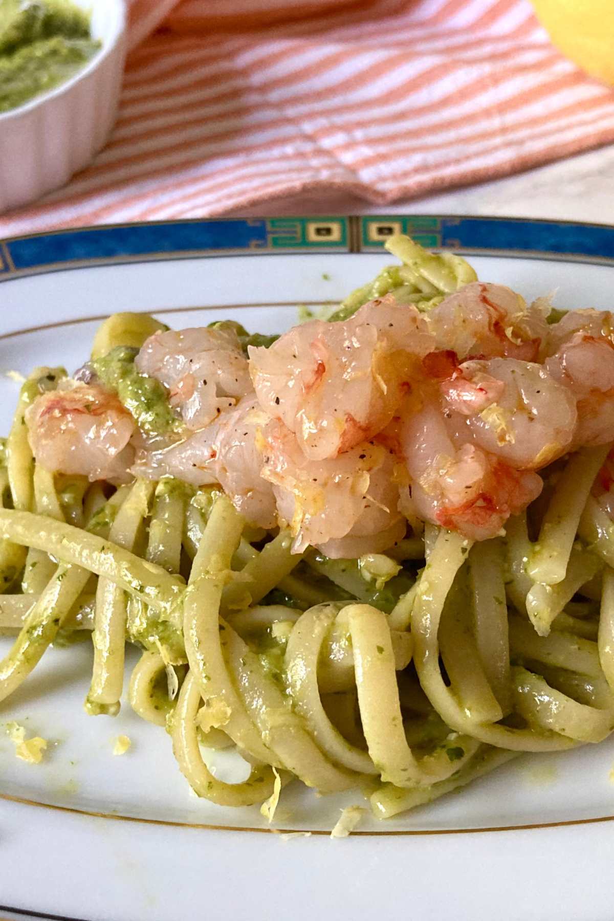 The shrimp are finely chopped and seasoned with olive oil, lemon zest and black pepper, creating a fresh and slightly sweet contrast to the rich, aromatic pesto.