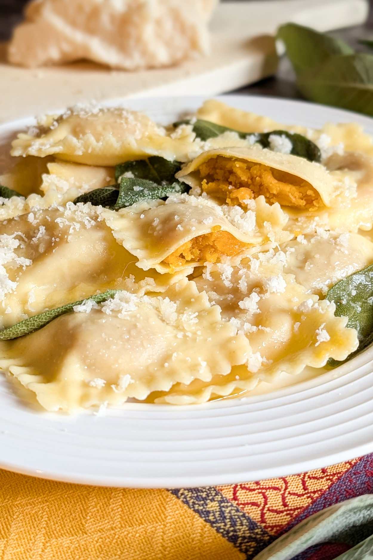 Serve immediately, topped with plenty of freshly grated Parmigiano Reggiano. The warmth of the butter, the aroma of sage, and the delicate sweetness of the pumpkin filling make these Italian Pumpkin Ravioli Tortelli di Zucca a truly irresistible dish.