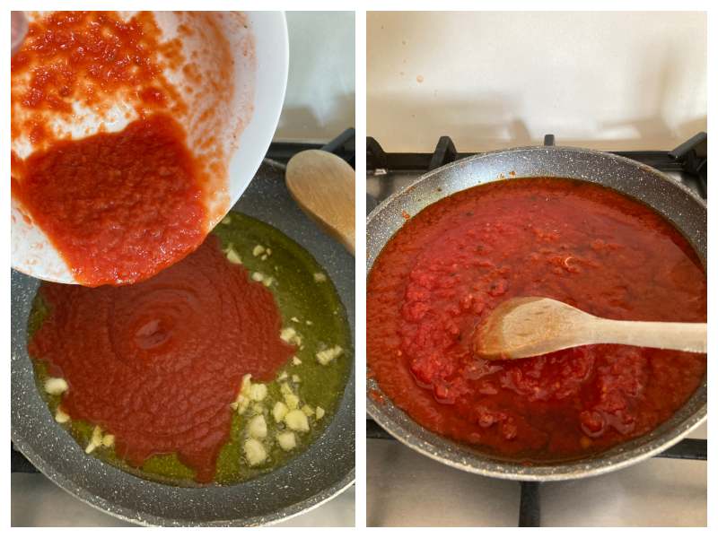 - Sauté in oil for a few minutes in a saucepan. Add the tomato passata and a pinch of salt.